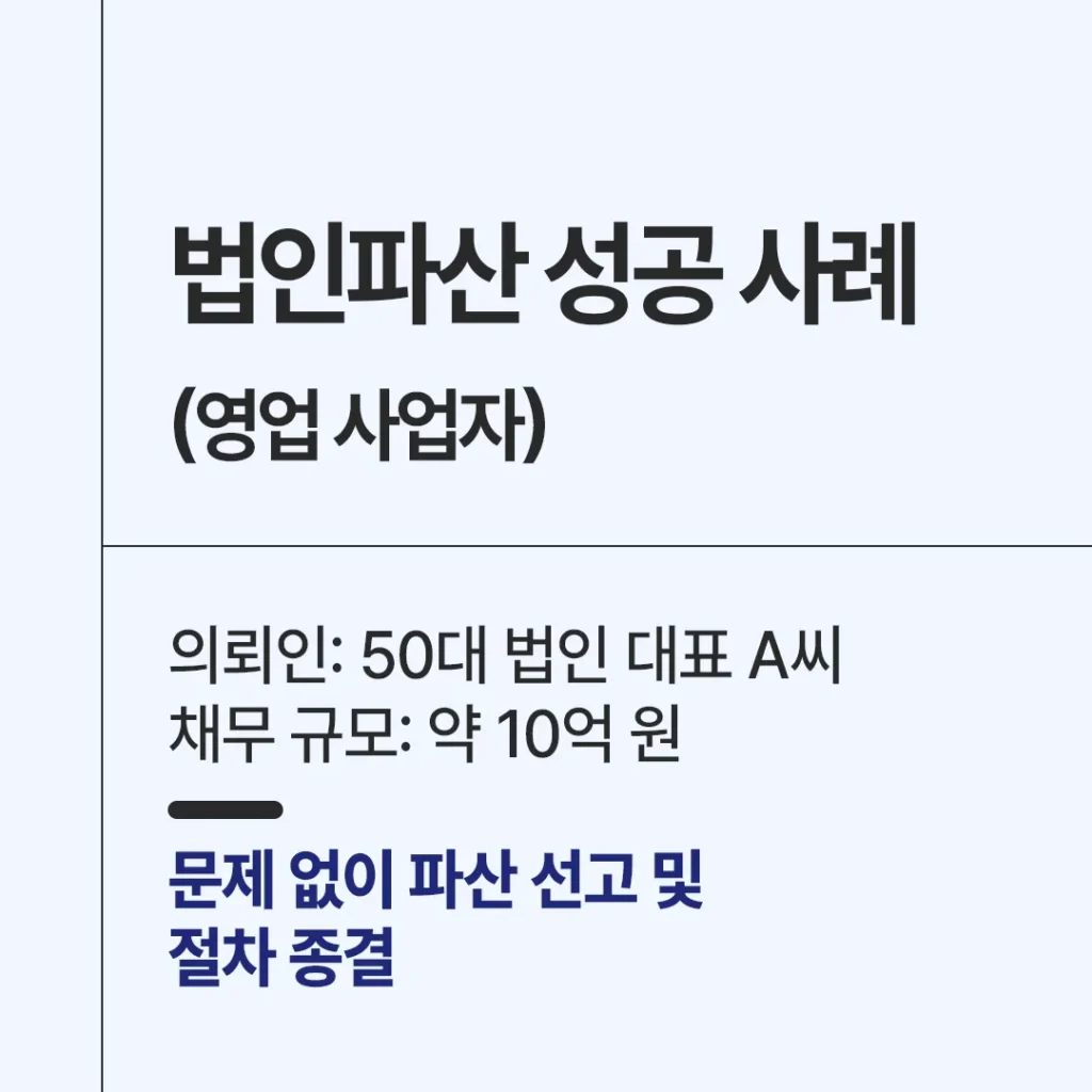당초 예상했던 기간보다 파산 절차가 빠르게 마무리되었고, 별다른 문제 없이 파산 선고 및 절차 종결에 이를 수 있었습니다.